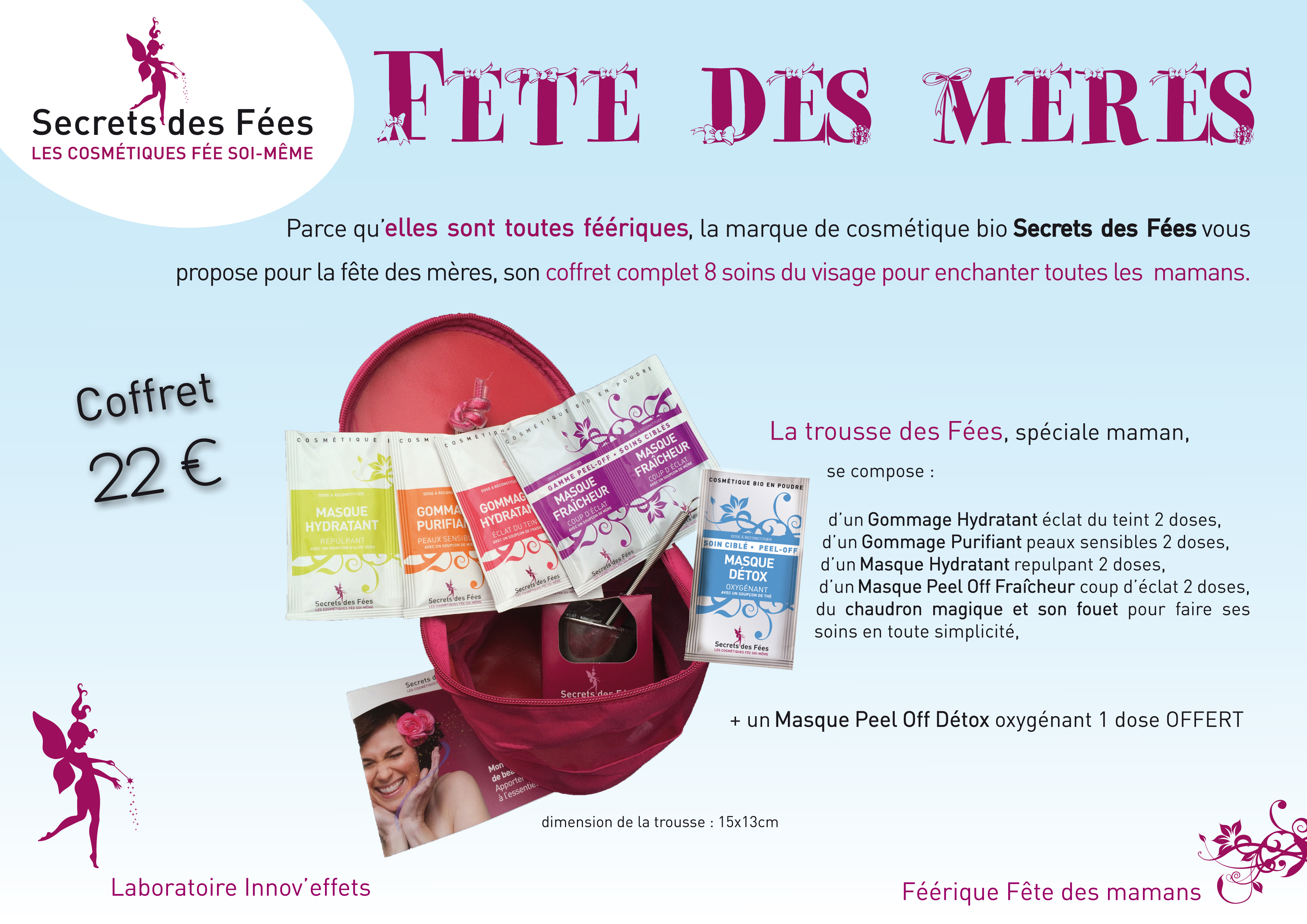 Le coffret Secrets des Fées est idéal à offrir à l’occasion de la fête des Mères pour faire découvrir ou redécouvrir – les merveilles des soins pour le visage, originaux, ludiques, pratiques et naturels, créés par le laboratoire Innov’effets.