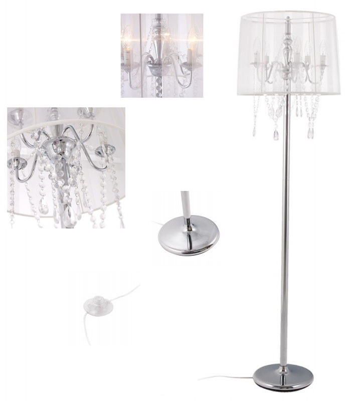 Cette lampe sur pied de style vintage est en tissu blanc et s’éclaire par 5 ampoules. La structure est en acier chromé, l’interrupteur se pose au sol pour faciliter sa commande par le pied. Existe en noir.