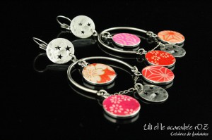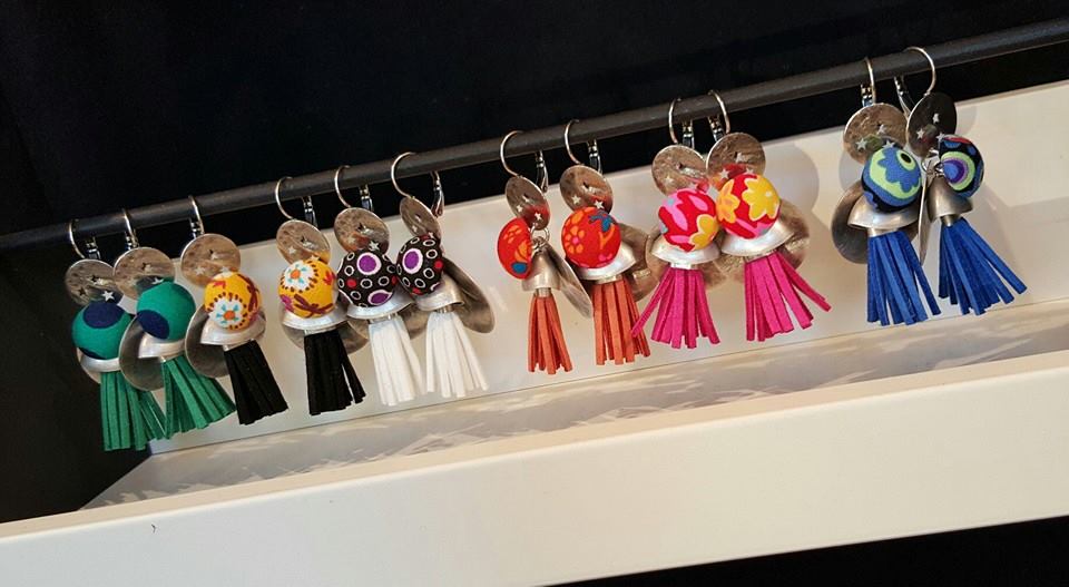 Je fabrique moi-même quasiment tous les éléments colorés que l’on retrouve sur les bijoux afin de trouver le juste équilibre. Je confectionne avec mes matières de prédilection que sont le tissu, le papier japonais, le cuir et le polymère. On y retrouve également des pièces de métal, des pompons, des perles de verre… Je crée aussi en partie avec des chutes de tissus et de cuir que je récupère auprès de créatrices ou de copines couturières.