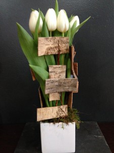 Cette composition est travaillée à la verticale, en parfait alignement avec les tiges des tulipes. Des lamelles de bouleau associées à des tiges d’osier confèrent à la composition tout son maintien, sa majesté et sa modernité.