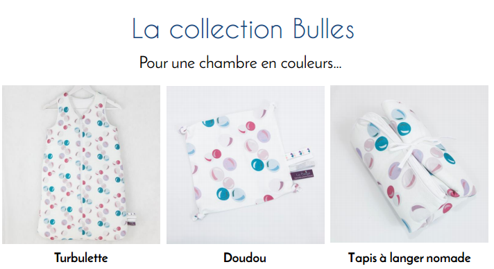 - la collection Bulles, pour une chambre en couleurs : comprend une turbulette, un doudou, un tapis à langer nomade, un tour de lit, un édredon, un nid d’ange, un lange imprimé.