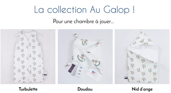 - la collection Au galop !, pour une chambre à jouer : comprend une turbulette, un doudou, un nid d’ange, un tour de lit, un édredon, un lange grand format, un lange imprimé.