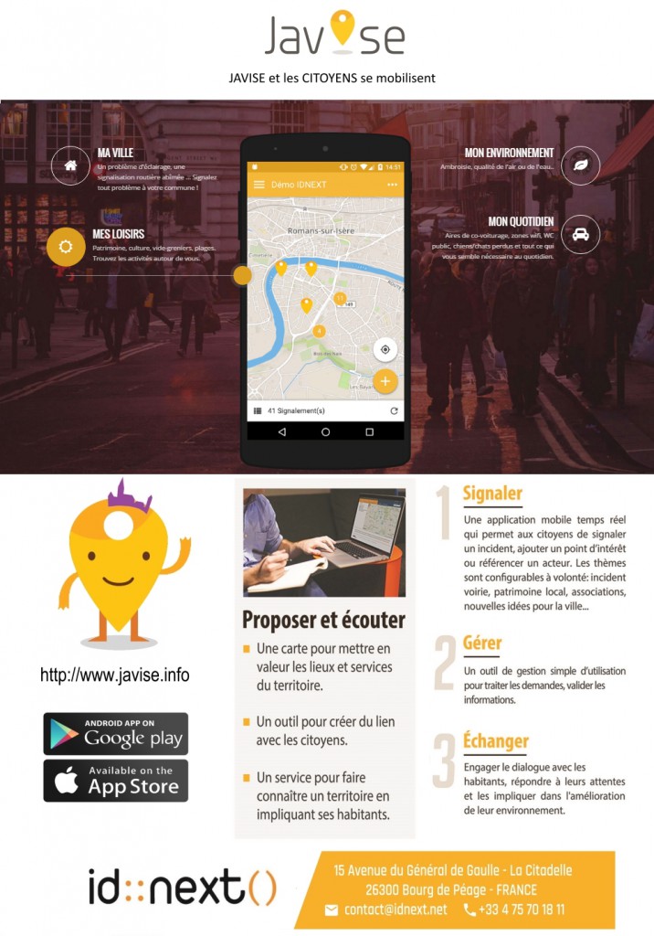 Javise est une application mobile englobante qui permet à tous de signaler un incident ou de signaler sur une carte thématique, un point précis.
