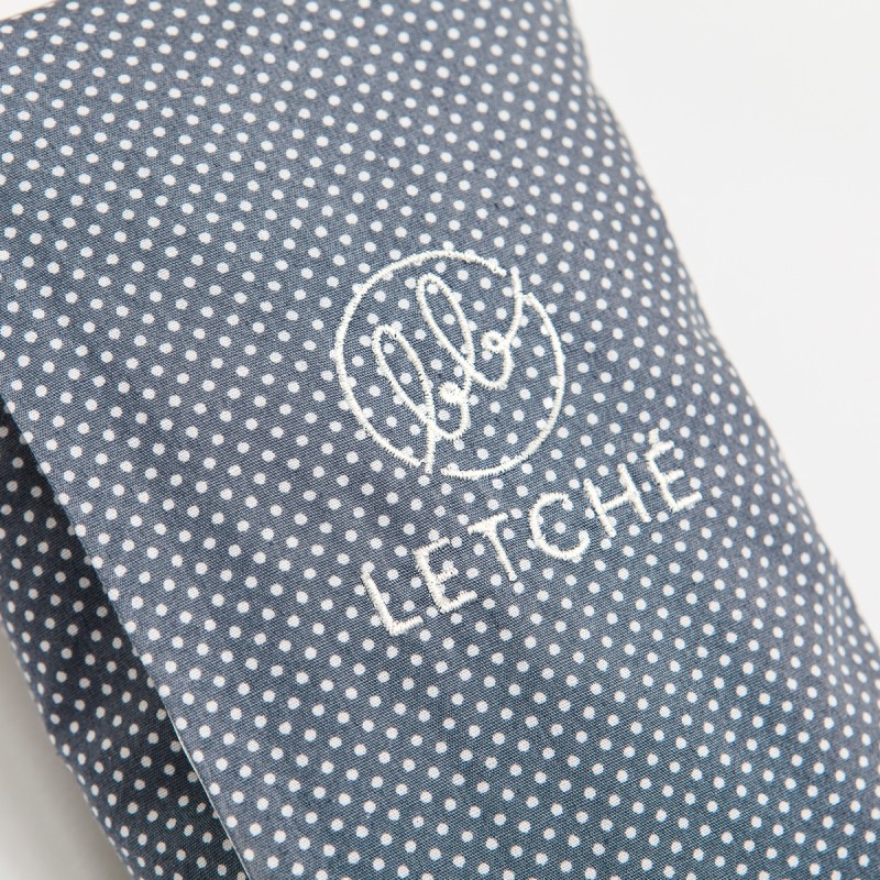 Ils sont disponibles en taille unique, et sont dotés d’une sangle réglable grâce à une boucle métallique. Ils sont réalisés en 100 % coton, dans un coloris gris souris à points tête d’épingle blancs, et sont lavables en machine.