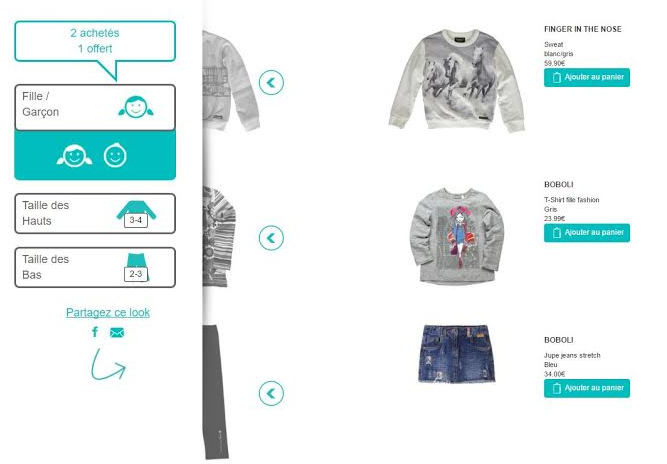 Il suffit d’affiner les critères de votre recherche grâce au configurateur. Vous visualisez alors les combinaisons possibles de vêtements pour les assortir selon vos/leurs goûts : rocks, classiques, flashy, girly, chics, choisissez la taille, la couleur et la coupe en un clic.