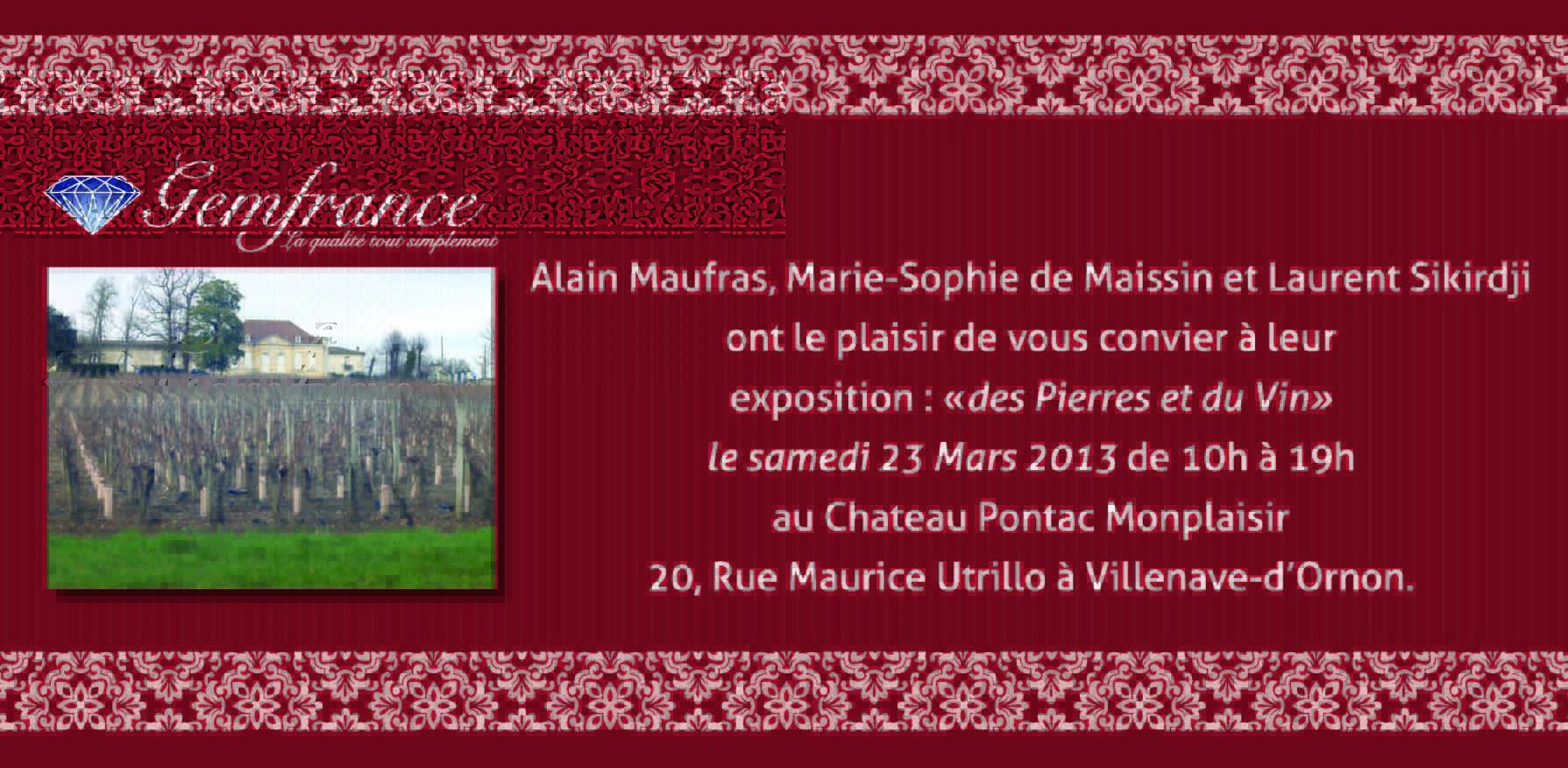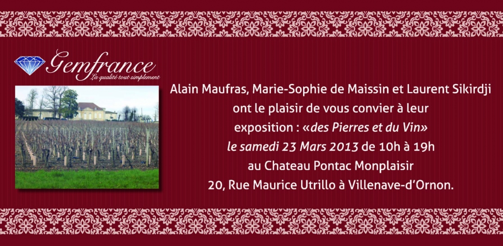 Le prestigieux Château Pontac Monplaisir ouvrira ses portes au public pour une journée découverte unique et insolite le samedi 23 mars 2013 de 10 h à 19 h sur le thème de l’oenologie et de la gemmologie. Parce que le vin est aussi précieux que certaines pierres, et que l’inverse est aussi vrai, les visiteurs pourront découvrir un univers de rareté, de passion et d’exception.