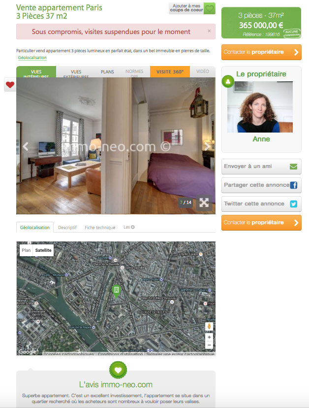 « Je n’avais pas de réelle stratégie de vente avant immo-neo.com, mon appartement est resté plus de 6 mois en agences, sur 6 mois je n’ai eu que 6 visites. Une fois l’appartement mis en ligne sur immo-neo.com j’ai été très rapidement contactée par des personnes très intéressées. J’avais fait des shootings avec les 2 précédents prestataires mais c’était nettement différent, il n’y avait aucune mise en scène de l’appartement et pas autant de photos… J’ai été 100% gagnante. »