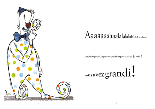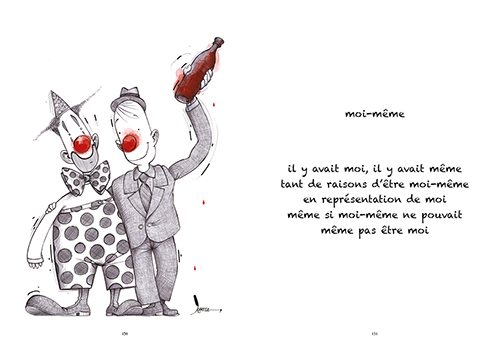 « Graphisme et mots poursuivent une même quête d’humanité dans un monde de dualité : rire et lucidité, violence et rêverie, faux nez et nez de clown. Une poésie de combat pour une bande de clowns.