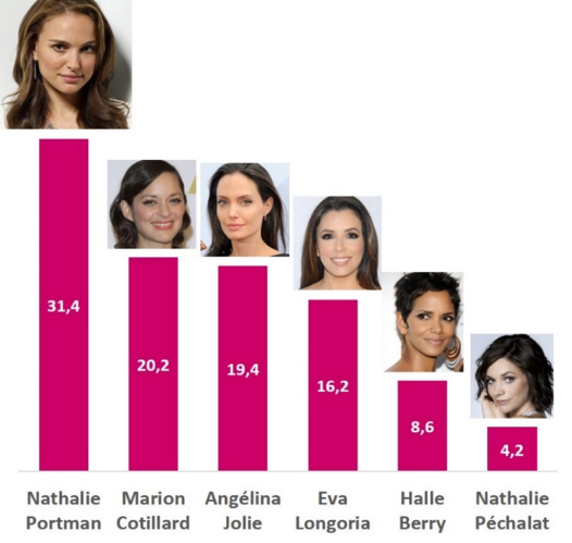 Nathalie Portman est la célébrité que les hommes aimeraient le plus pouvoir embrasser avec 31% des réponses. Marion Cotillard et Angelina Jolie arrivent en seconde place, presque à égalité. Nathalie Péchalat arrive quant à elle en dernière place avec seulement 4%.