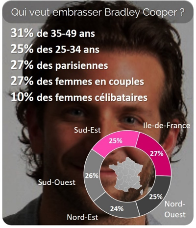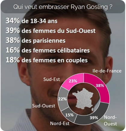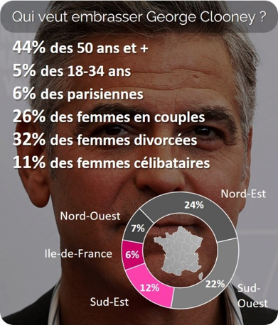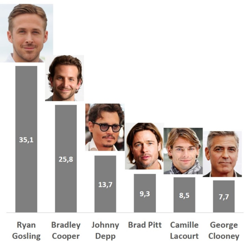Ryan Gosling est à la première place, 35% des femmes aimeraient pouvoir l’embrasser. Bradley Cooper arrive en seconde position avec 1 française sur 4 qui aimerait pouvoir l’embrasser. En revanche, George Clooney n’a plus la cote, il ne rassemble que 8% des françaises.
