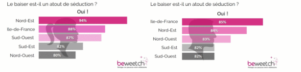 Une certaine diversité de la perception du French Kiss est également observée en fonction de la situation géographique des personnes interrogées. Du côté des femmes, 57% en Sud-Ouest jugent cette maîtrise importante contre 32% seulement en Sud-Est. Les hommes du Sud-Ouest sont également les plus nombreux à juger importante la maîtrise du French Kiss avec 58% d’opinion favorable pour seulement 45% pour les hommes résidents dans le Nord-Est de la France.