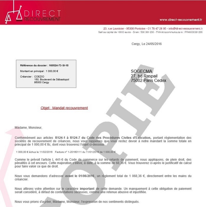 - Et si rien ne marche, le cabinet Direct Recouvrement se charge d’adresser des relances aux débiteurs