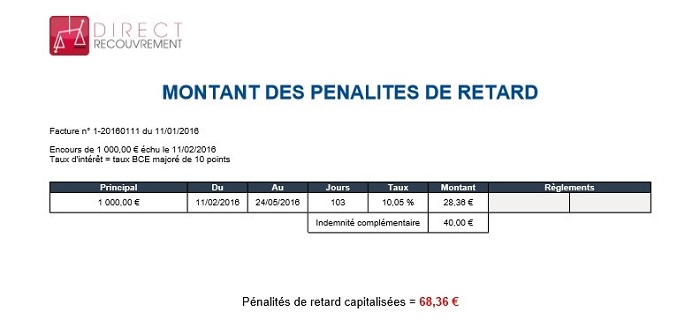 En quelques clics, chaque entreprise peut calculer les pénalités de retard, éditer un justificatif de calcul, imprimer des courriers professionnels et faire adresser automatiquement des relances par un cabinet de recouvrement (Direct Recouvrement) aux débiteurs (envoi simple, recommandé avec Accusé de Réception et e-mail).