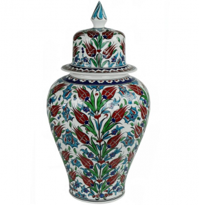 C’est par exemple le cas du vase fin Hava, en poterie d’Iznik. Le vase Hava, d’une hauteur de 25cm, présente un design élégant et un décor composé de spirales fleuries, héritages des célèbres céramiques d’Iznik du style Haliç (Corne d’Or). Cette pièce d’artisanat d’art a été réalisée et décorée à la main. Chaque vase est donc unique.