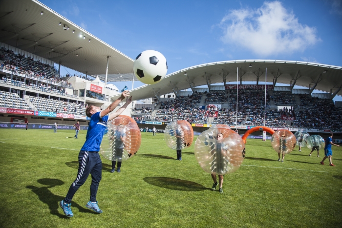 - Un véritable encadrement pour s’amuser en toute sécurité : il y a deux terrains gonflables (une de 20x10m et une modulable de 40x25m) pour délimiter la zone de jeu et assurer l’intégrité physique des participants et du matériel.