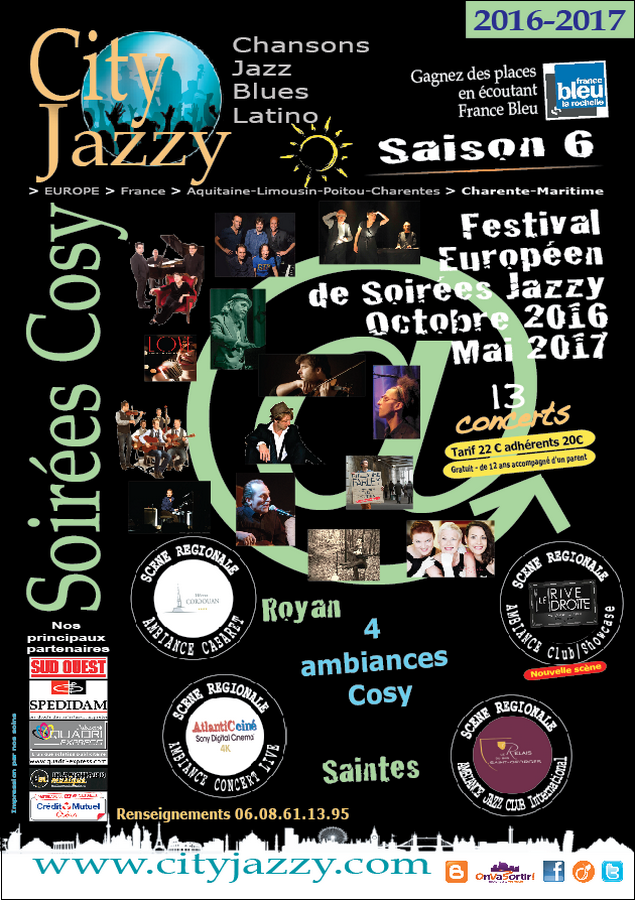 Pour sa 6ème édition, CityJazzy revient, pour le plus grand plaisir des Charentais-Maritimes, avec son concept qui a fait ses preuves, l’organisation de Soirées de qualité Cosy, pour replacer le temps que quelques soirées, la musique au cœur de nos vies.