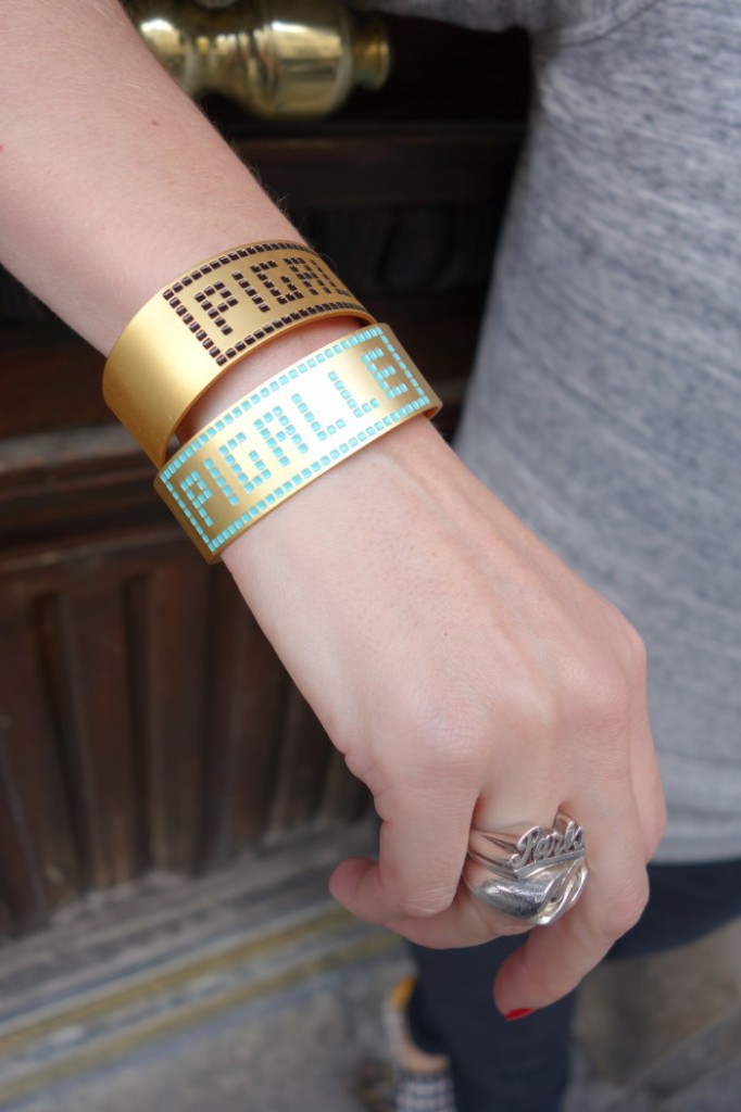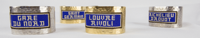 - les bijoux sont réalisés à partir de matières, notamment des perles, de très grande qualité et tissés selon des méthodes traditionnelles (manchettes) mais aussi des bracelets fins en étain doré, laqués noir ou turquoise (Pigalle).
