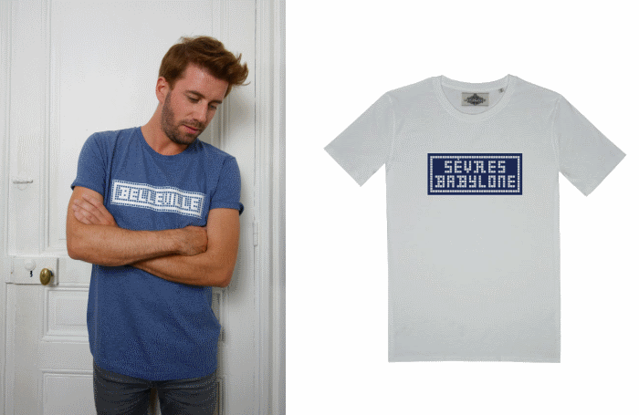 - les t-shirts homme. Ils existent en blanc, opal ou bleu impression bleue, noire ou blanche : Belleville, Gare du Nord, Saint-Germain, République, Sèvres Babylon…