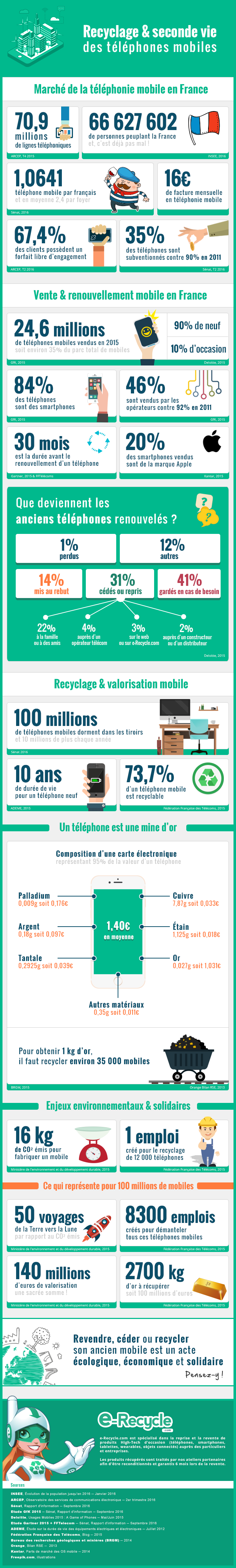 A l’occasion de la journée mondiale du recyclage le 15 Novembre 2016, E-Recycle, entreprise spécialisée dans la reprise et la revente de produits high tech d’occasion (téléphones, smartphones, tablette, wearables, objets connectés) auprès des particuliers et professionnels fait le point sur la seconde vie des téléphones mobiles et vous présente son infographie PDF (également disponible au format image en bas de ce communiqué de presse).