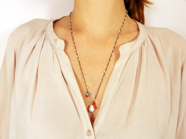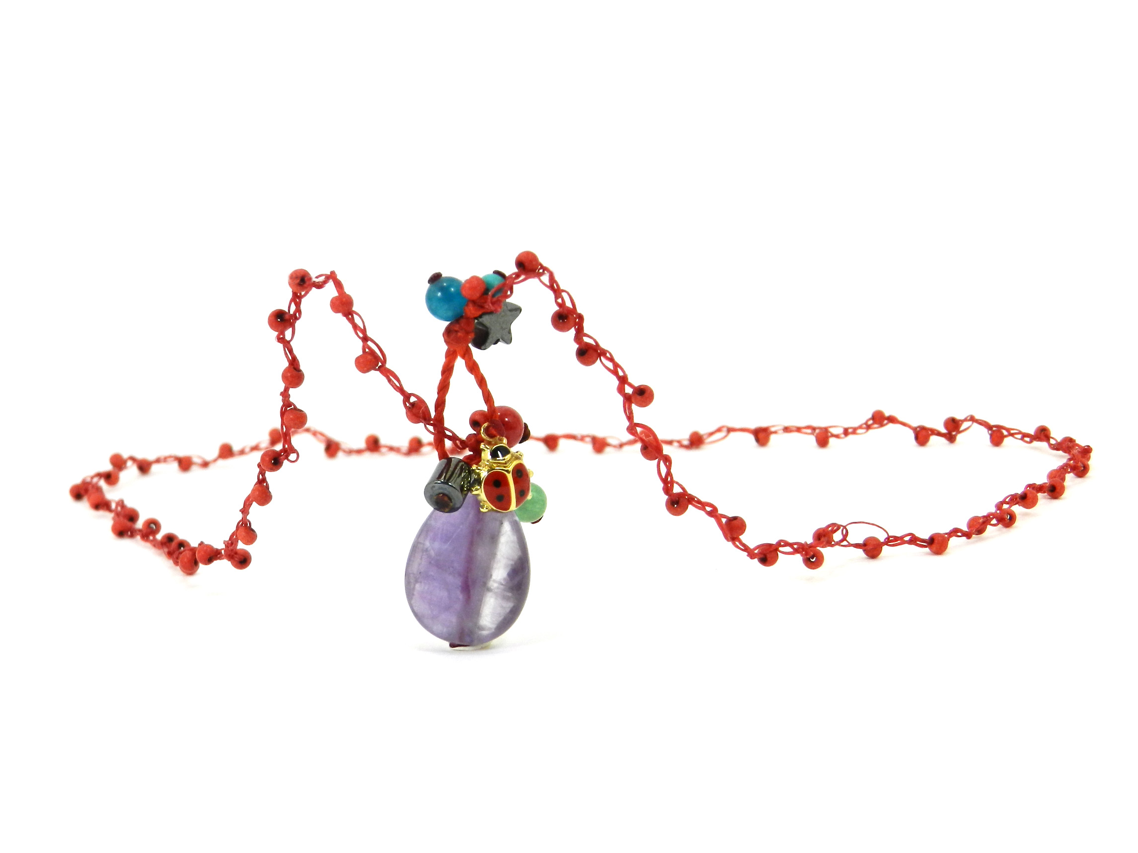Améthyste, agate, corail bambou, turquoise et hématite sur un fil de nylon ciré, avec une petite coccinelle en or 750 émaillé. Un mix délicat et raffiné, représentatif des créations Oca.