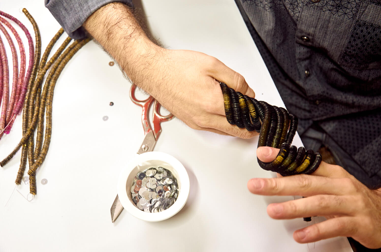 De la même façon, les bijoux et accessoires de la marque Nabob Chantal sont entièrement faits à la main, avec un design fort et des combinaisons sophistiquées de matériaux inhabituels, généralement issus de la récupération et du recyclage.