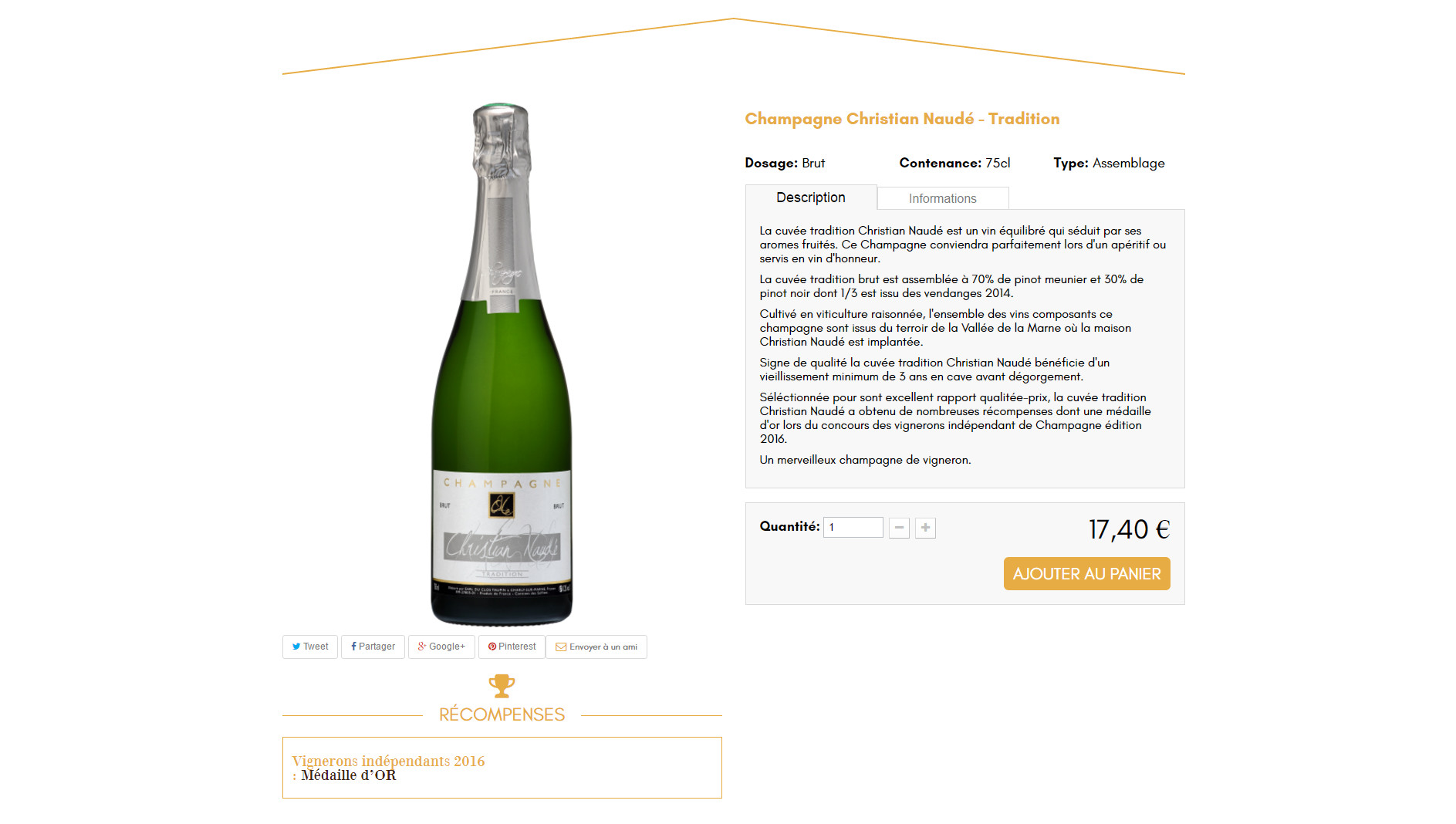 - le champagne Christian Naudé Tradition : un vin équilibré qui séduit les palais par ses arômes fruités. L’ensemble des vins composant ce champagne issu d’une viticulture raisonnée proviennent de la Vallée de la Marne, où est implantée la maison Christian Naudé. Ce champagne a obtenu de nombreuses récompenses, dont une médaille d’or lors du concours 2016 des vignerons indépendants de Champagne.