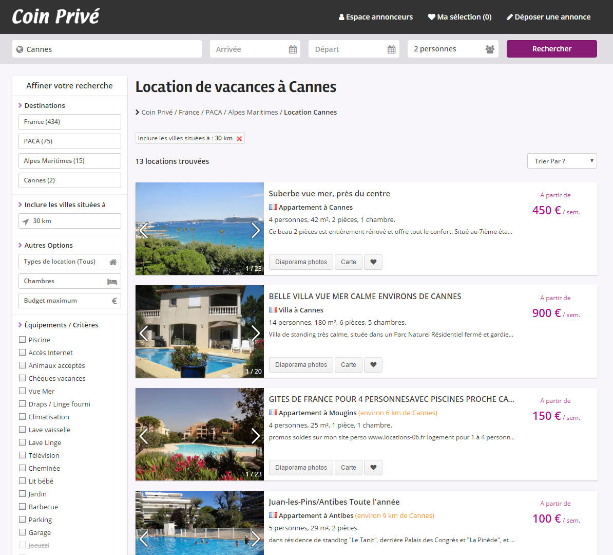 A l’heure où de nombreuses plateformes de locations de vacances fonctionnent avec un système de réservation en ligne rémunéré par des commissions sur les transactions, Coin Privé a décidé de fonctionner sur le modèle de la petite annonce permettant ainsi des échanges directs entre loueurs et locataires.