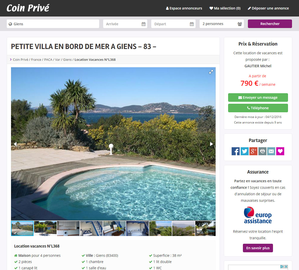 - des annonces de locations de vacances exclusivement de particuliers à particuliers