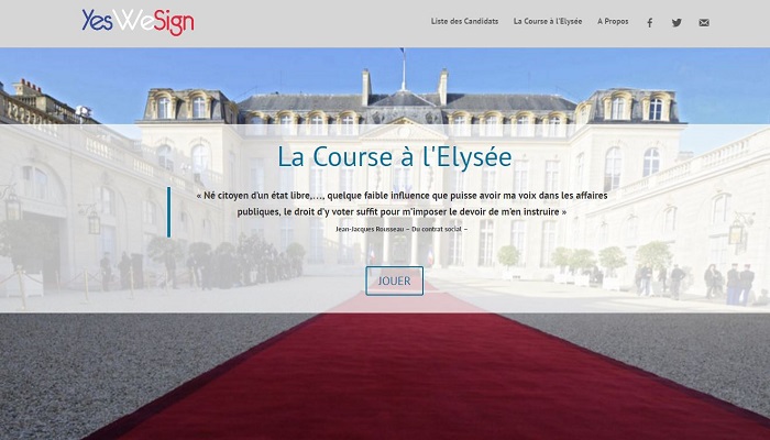 YesWeSign est une initiative qui contribue à réconcilier les Français avec les élections et surtout avec la démocratie. Ce site d’informations prend la forme d’un jeu ludique qui compare tous les programmes politiques afin d’intéresser les citoyens qui ne croient plus en la politique, d’aider ceux qui ne savent pas quel candidat représente le mieux leurs idées… mais aussi de perturber ceux qui sont parfois un peu trop sûr de leurs opinions !