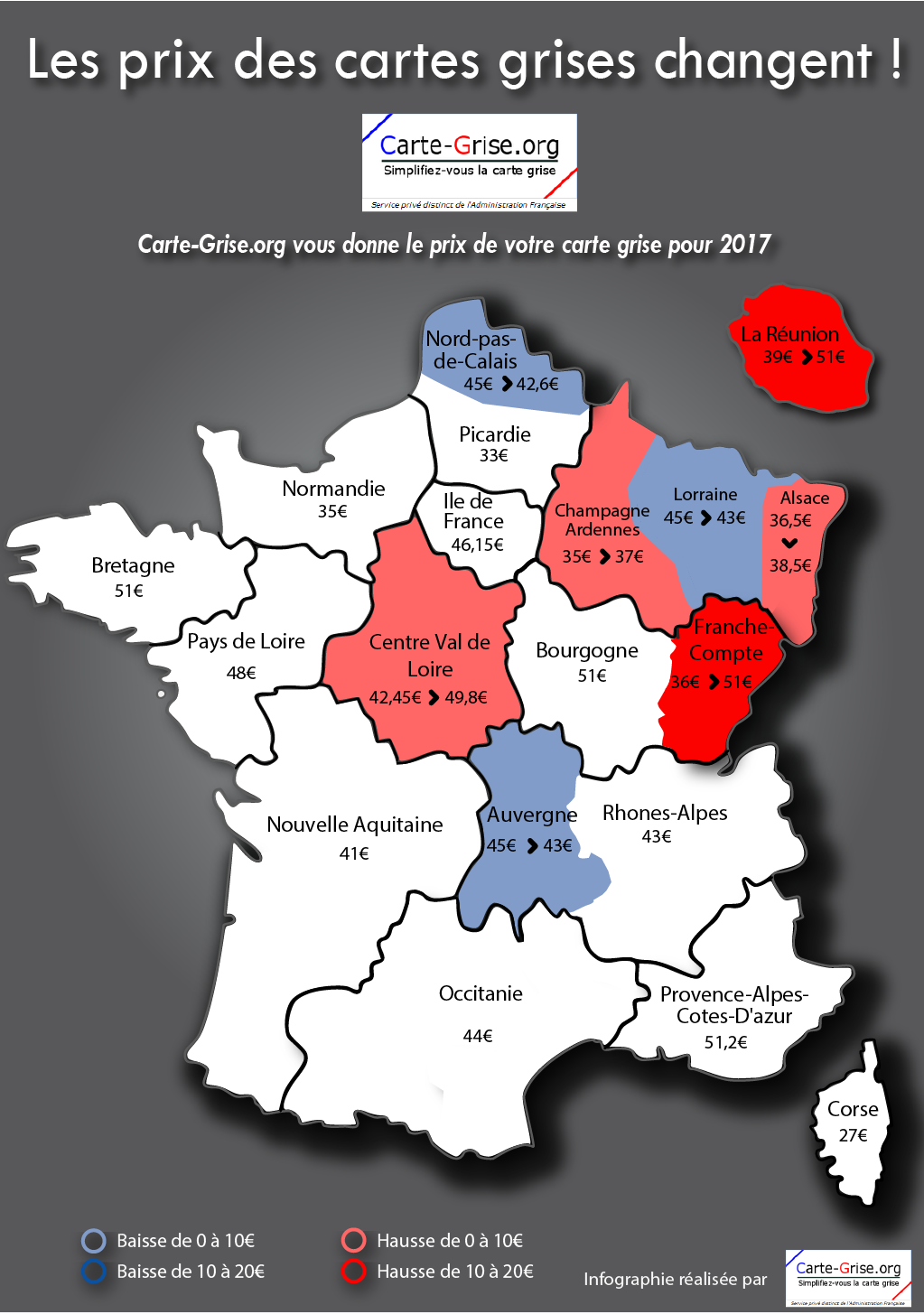Cependant, en matière de cartes grises, il y a des subtilités : en fonction de leur région de résidence, les Français ne sont pas tous logés à la même enseigne. Il peut y avoir des hausses de prix (parfois spectaculaires !), des baisses, et même un statut quo.