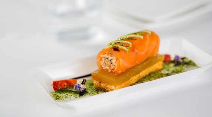 Médaillon de homard et canard fumé aux aubergines et piment doux