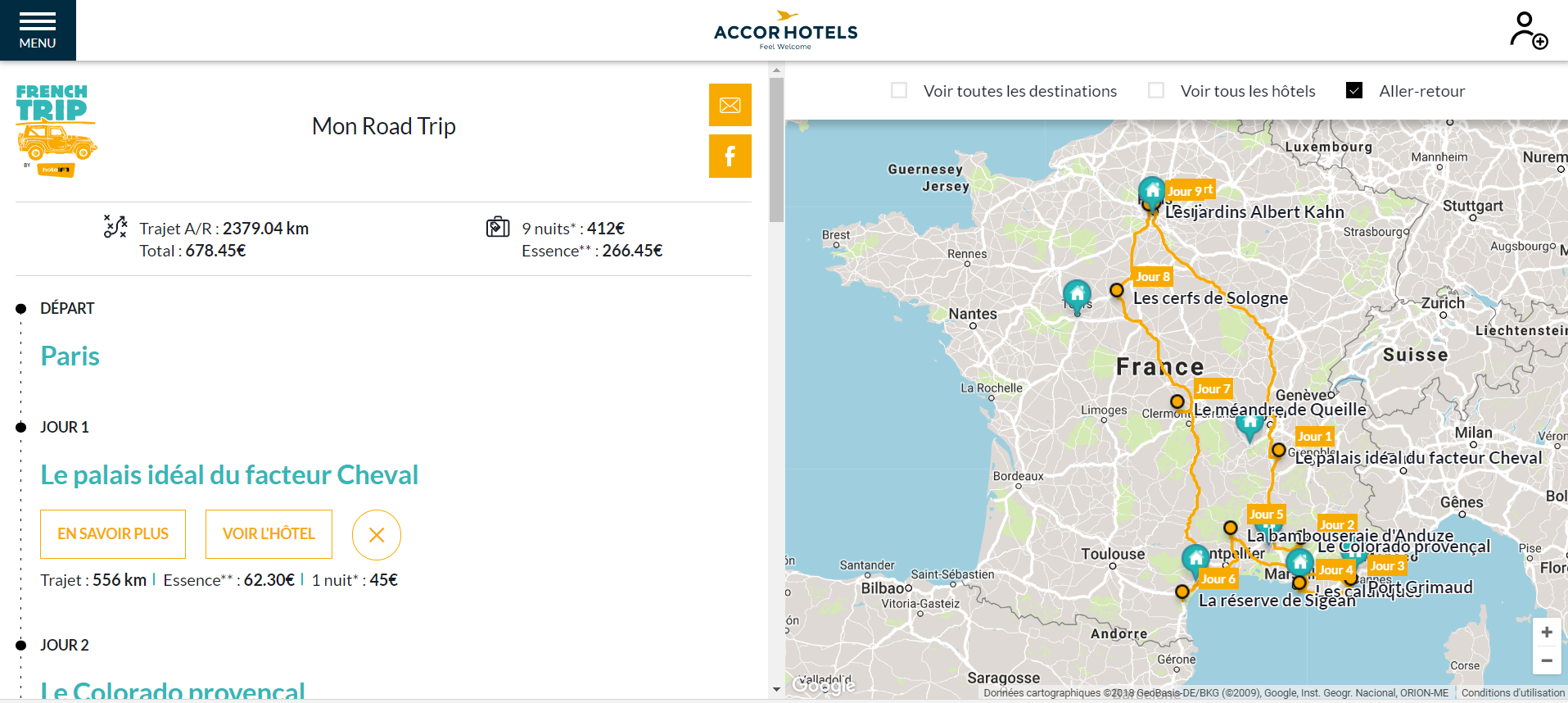 French Trip by hotelF1 propose une expérience où l’utilisateur sera inspiré par des paysages époustouflants qui mettent en valeur toutes les richesses insoupçonnées de la France. Chaque visiteur pourra donc générer un itinéraire personnalisé selon ses aspirations et son lieu de départ. Chaque séjour étant rattaché à un hotelF1 et à une expérience à vivre dans ce périmètre. Avec un design original, des visuels inédits, l’expérience de l’utilisateur est poussée à son maximum dans le but d’offrir un service digital utile, facile d’utilisation et collaboratif.