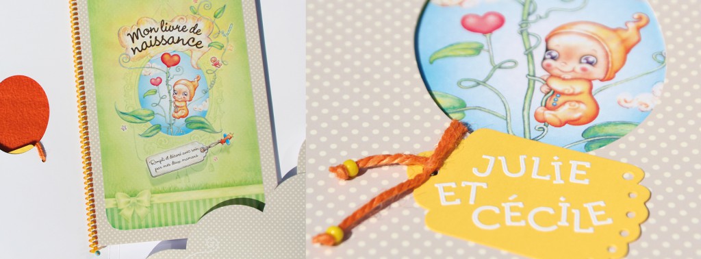 A noter que pour un livre de naissance personnalisé, Clarisse Placard apporte une touche unique, en inscrivant à la main le prénom de l’enfant (ou les prénoms des jumeaux/jumelles) sur une petite étiquette cartonnée de couleur, sur la pochette entourant le livre, ainsi qu’à l’intérieur.