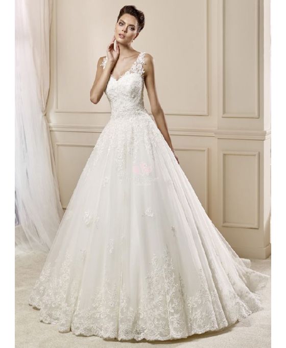 Cette robe de mariée trapèze à col en V et à larges bretelles est décorée d’applications fleuries. Elle est dotée d’une longue traîne chapelle, et se décline en trois couleurs : ivoire, blanc, et champagne.