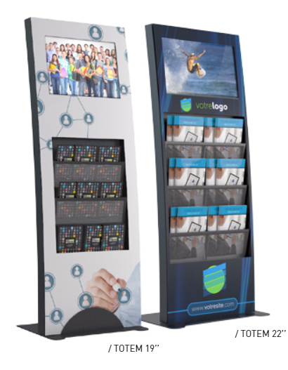 Une large gamme de bornes et de totems sont proposés (tarifs à partir de 95 €) : totems pour espaces réduits, écrans de 10 à 80 pouces, combinaisons intégrant un porte-brochures et un écran vidéo, miroirs magiques détectant le mouvement….