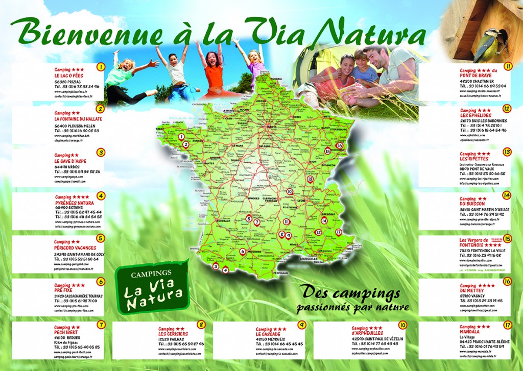 Les campings de La Via Natura accueillent les voyageurs qui souhaitent camper dans des sites naturels préservés et s’immerger dans la nature. Ils assurent aux campeurs accueil personnalisé, confort, convivialité et échanges. L’association regroupe aujourd’hui 17 établissements fédérés autour d’un engagement commun pour l’environnement et les hommes. Il s’agit de campings à taille humaine, avec moins de 120 emplacements, 70% des emplacements au minimum étant réservés aux tentes, caravanes et camping-cars.
