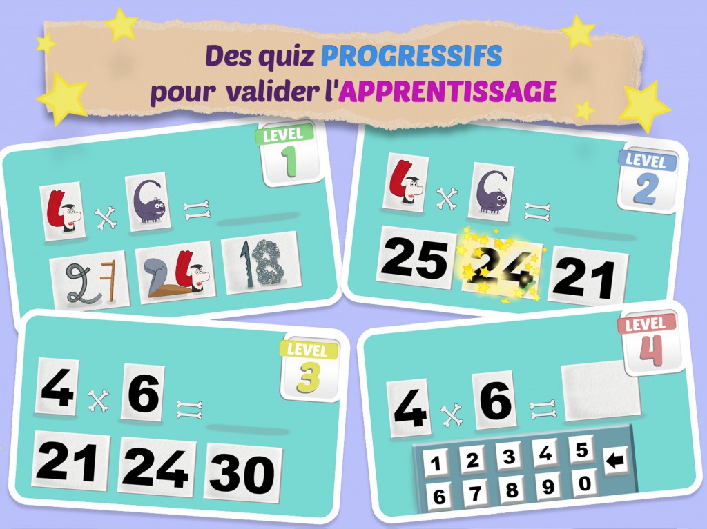 L’application et la plate-forme dédiée ont été pensées pour que l’enfant puisse découvrir, apprendre, comprendre et valider ses acquis autour de la multiplication.