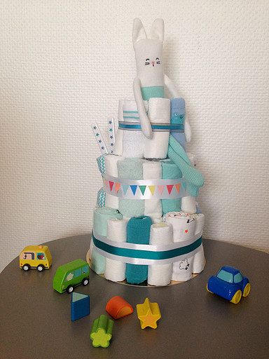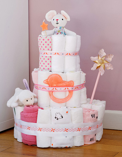 Star inconditionnelle de la Baby Shower selon la tradition américaine, le diaper cake est considéré par les futures mamans comme un véritable trousseau de naissance. En forme de pièce montée, il est composé de couches pour bébé et agrémenté de petits cadeaux : bodies, hochet, bavoir, nécessaire de toilette, etc.
