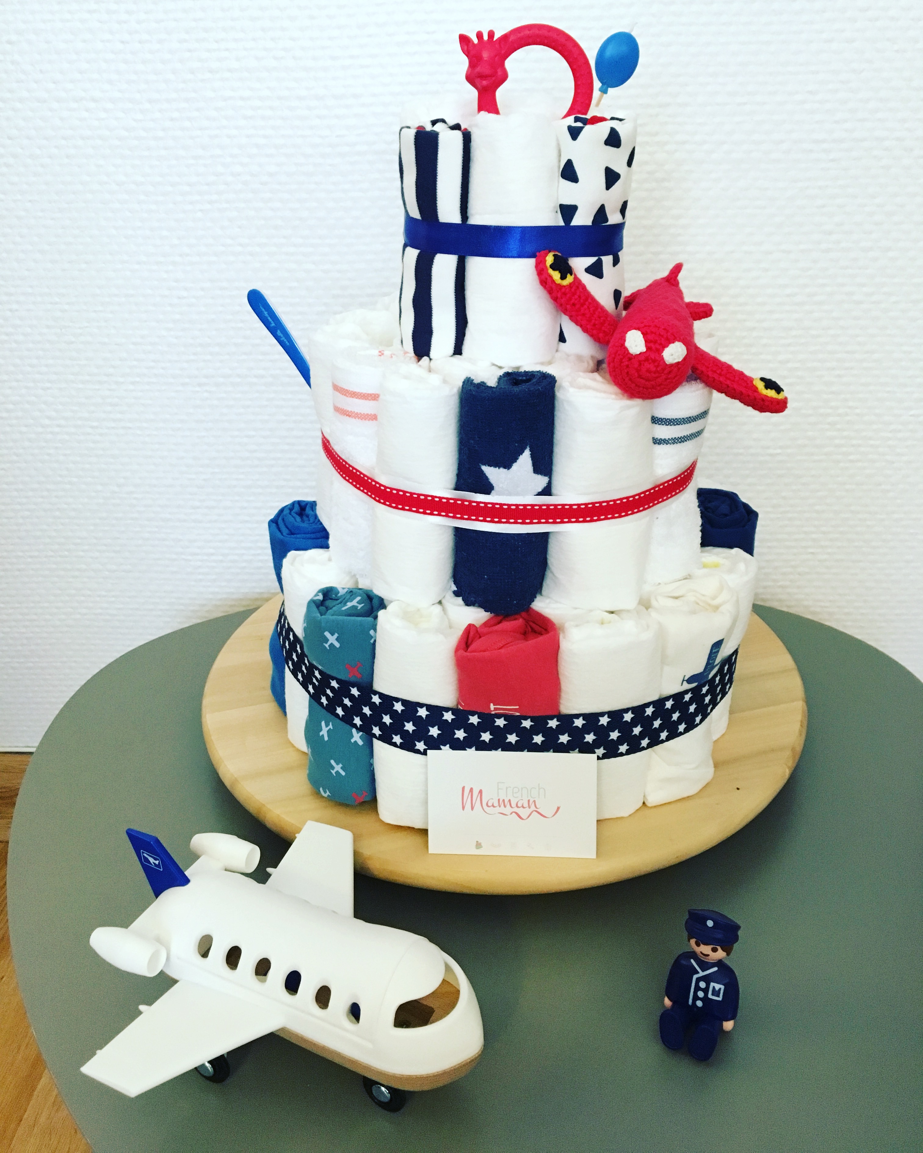 Composition aux couleurs de la célèbre compagnie aérienne française pour un jeune papa pilote réalisée avec les couches Love and Green taille 2 (3 bodies thème avion, langes assortis, serviettes visage et mains, bavoirs, cuillère bébé, hochet en crochet fait main, anneau de dentition et bougie pour le premier anniversaire de bébé)