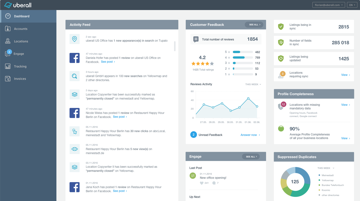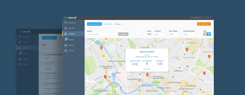Afin que le client puisse comprendre la démarche uberall et suivre pas à pas la progression de sa visibilité, un “Control Center” lui permet de manager et d’analyser les données de ses di?érents emplacements. Il est aussi un outil pratique pour analyser les campagnes de marketing local mises en place.