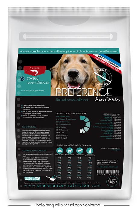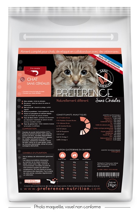 Disponible en conditionnements de 3kg et 10kg, la gamme Préférence Sans Céréales est vendue exclusivement chez les vétérinaires.