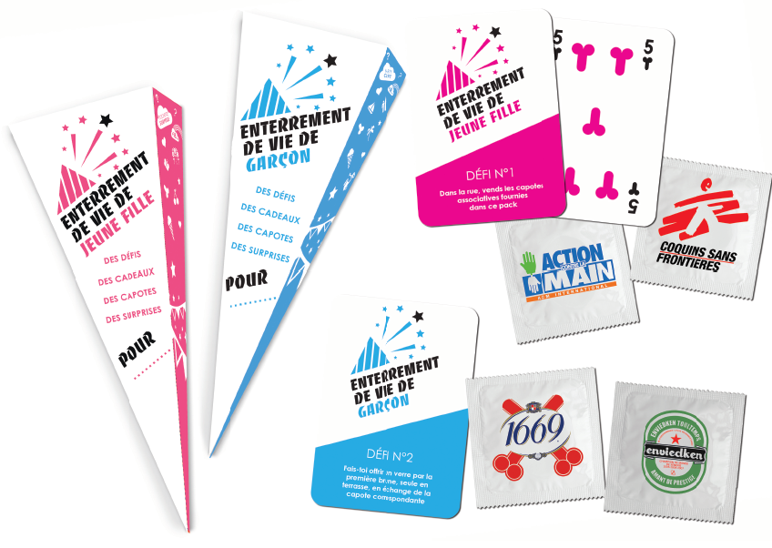 Différent pour les garçons ou les filles, chaque cône se compose d’un jeu de cartes sur lesquels sont présentés 7 défis, de 12 préservatifs, d’un stylo et d’une huile de massage.