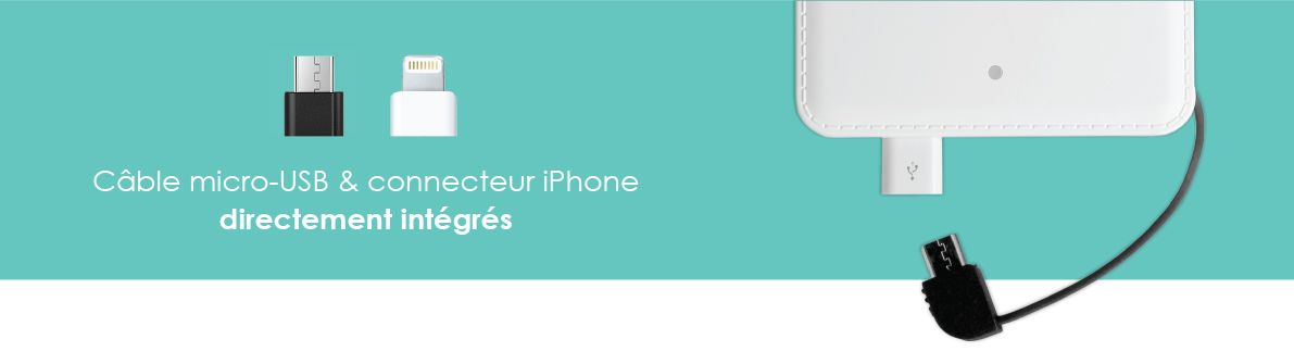 Fini le câble oublié, le câble qui n’est pas le bon, ou celui qui encombre la poche, Accoo est dotée d’un câble micro-USB et d’un adaptateur Lightning -iPhone 5, 6 et 7 – intégrés. Il est même possible d’y intégrer un adaptateur type-C pour sauver la situation à tous les coups.