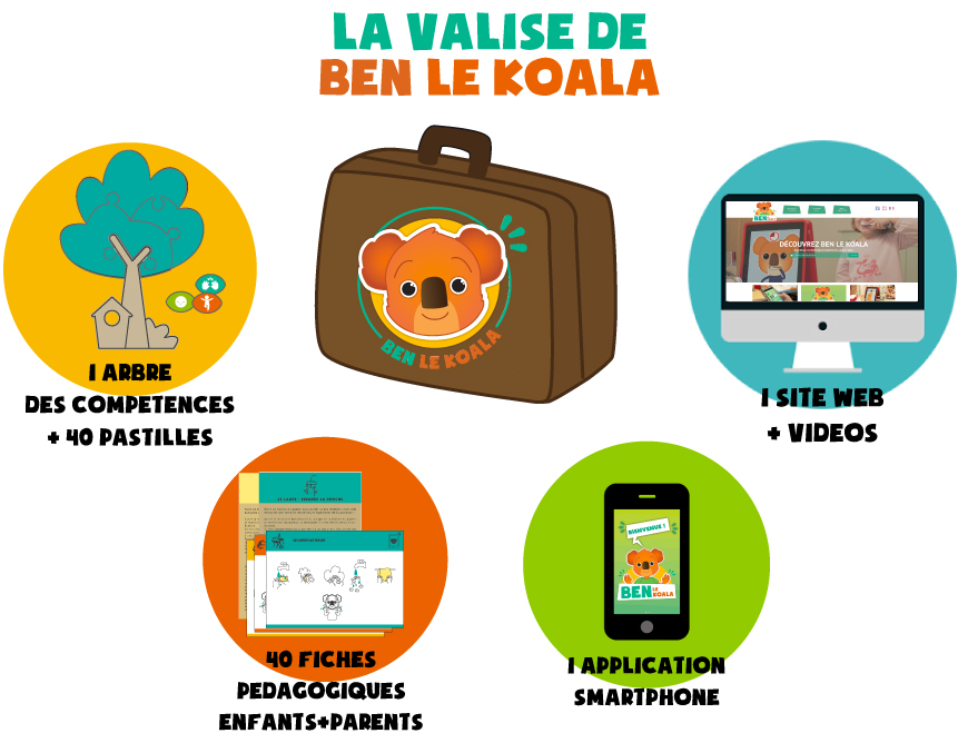La Valise de Ben le koala est pensée pour faciliter la vie des parents et des enfants au quotidien en articulant différents supports pédagogiques complémentaires :
