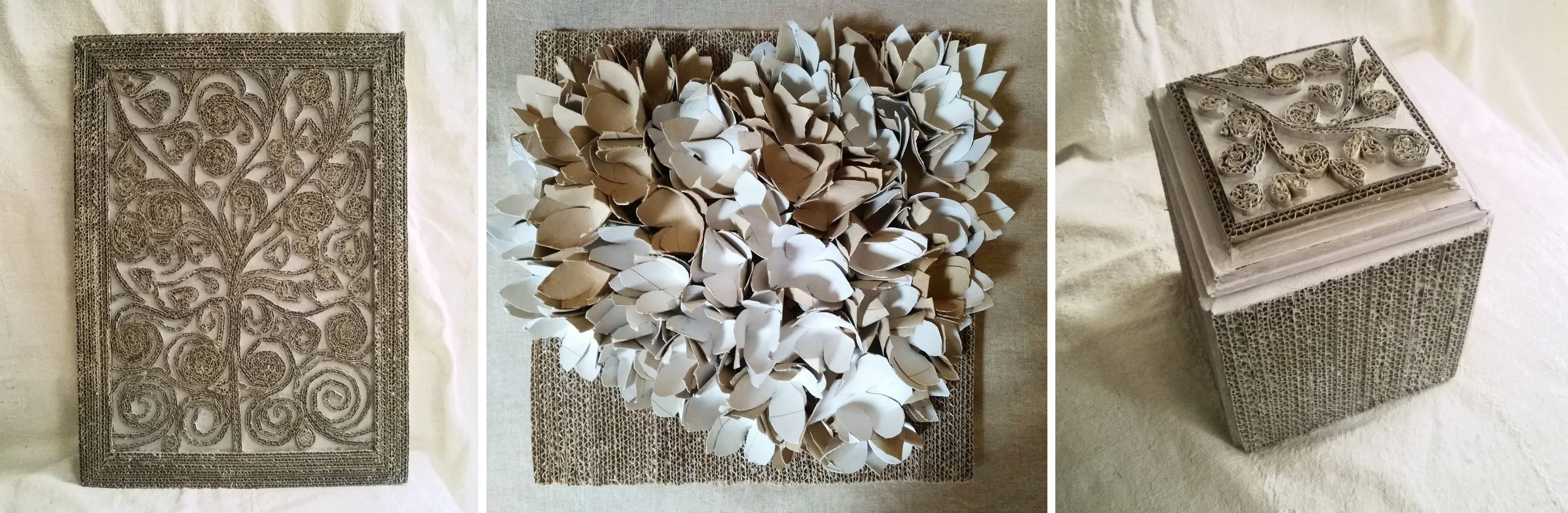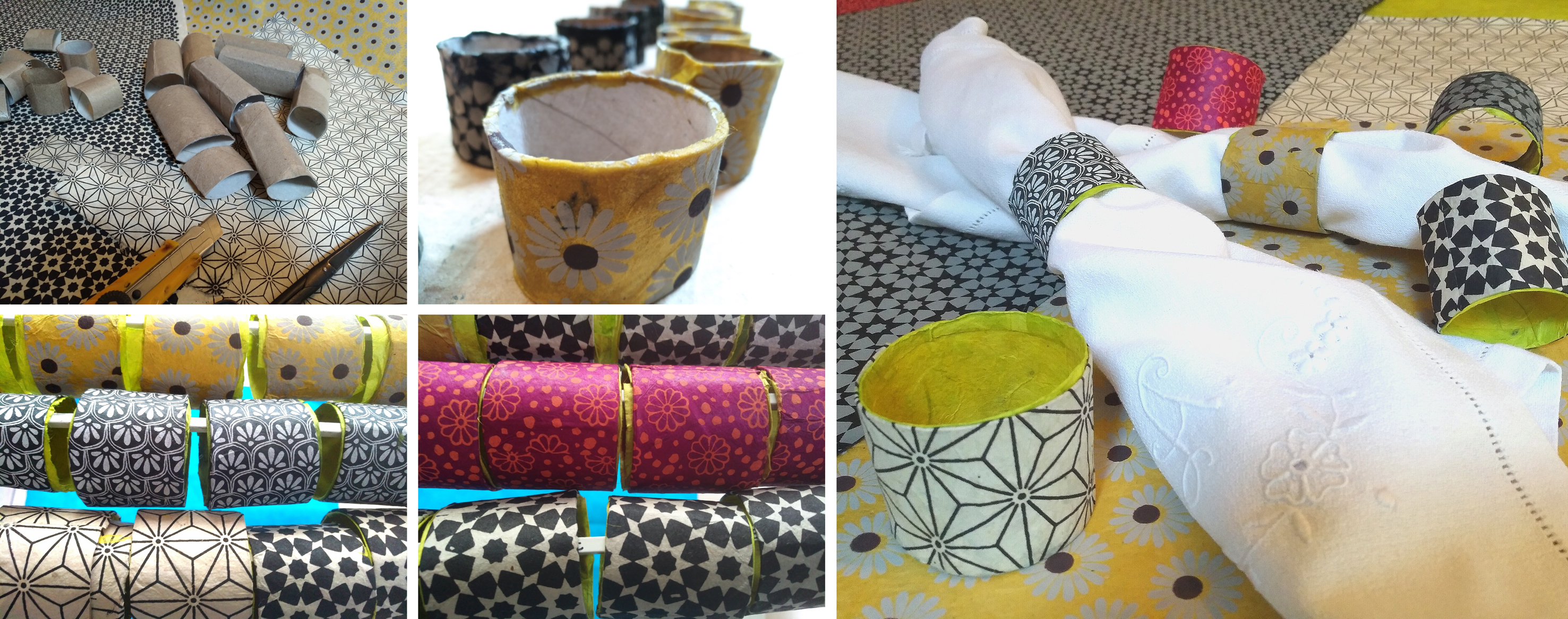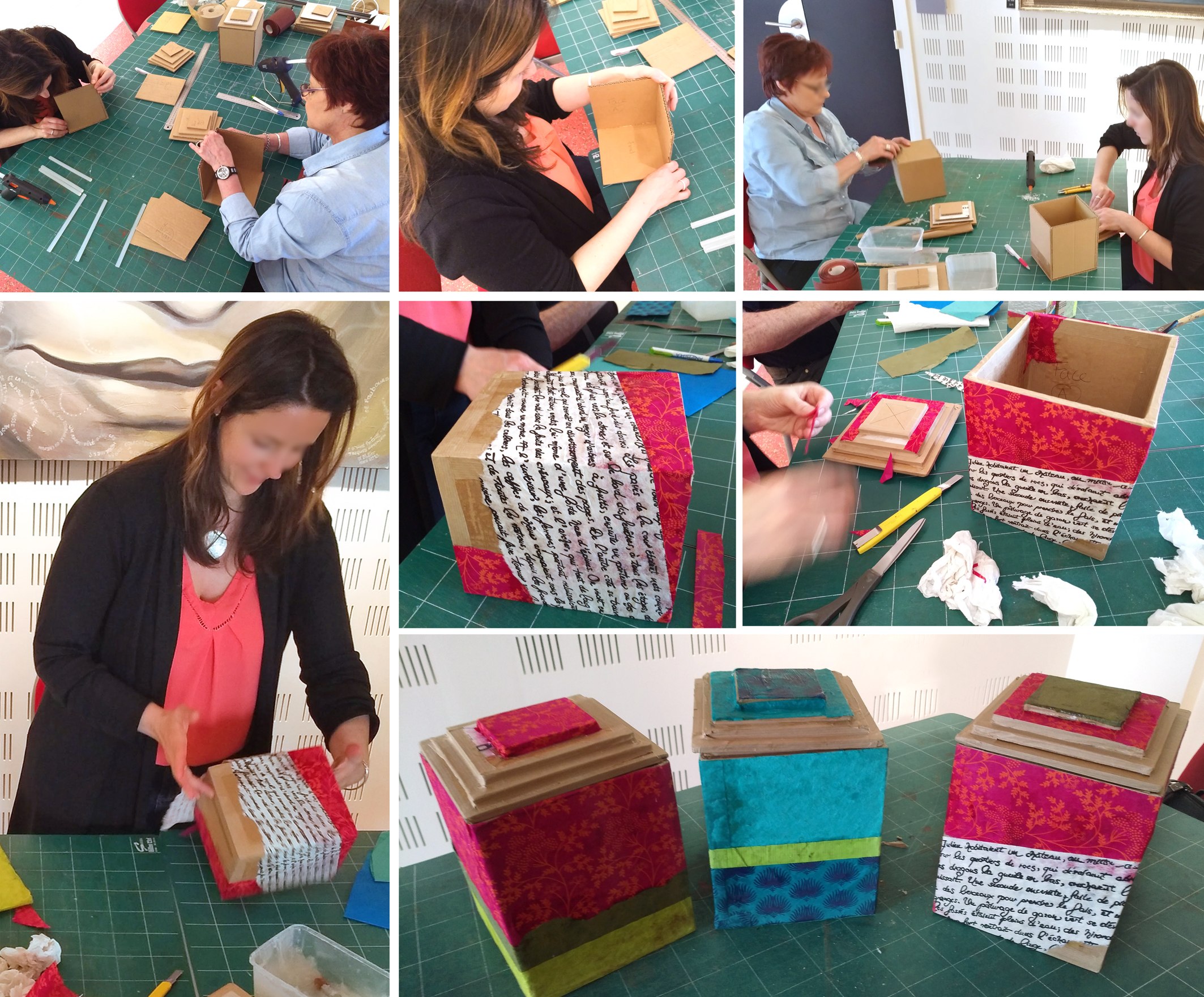 Réalisation, en groupe de 5 personnes, de petits objets déco-écolo en carton, pour lesquels le matériel est fourni : boîte à thé, porte-bijoux, plateau, Décor mural… Dans l’esprit des célèbres réunions à domicile, elles ont lieu chez « l’hôtesse » pour qui l’atelier est offert !