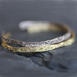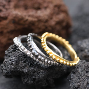 A gauche - Alliances Nyamanti pointillées en argent vermeil… déclinées en brut, rhodié, poli, rose ou noire. A porter seule ou en superposition selon les styles.