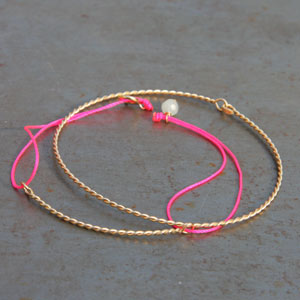 A droite - Bracelets Gilbert-Gilbert : l’un, Eugénie, avec lien fluo et l’autre en jonc torsadé or… à unir pour le meilleur effet !