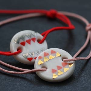 A gauche – Bracelet « Jour de fête » avec pastille de porcelaine décorée de touches d’or et couleur.