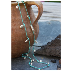 A gauche – Sautoir Lovepépite avec pépites en argent massif montées sur un lien vert-jade.