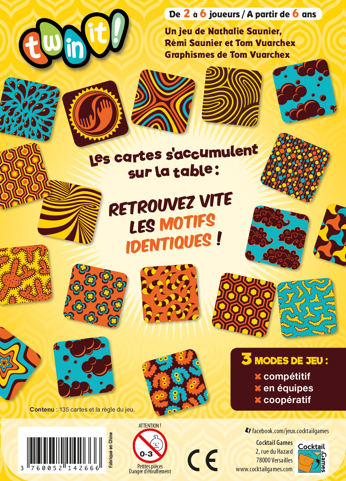 Fidèle à son concept de jeux simples, rapides et conviviaux, Cocktail Games lance Twin it, un nouveau jeu d’observation et de rapidité imaginé par Nathalie et Rémi Saunier ainsi que Thomas Vuarchex, qui signe également les illustrations et qui n’est autre que le papa du célèbre Jungle Speed.